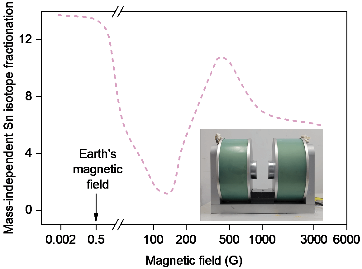 Relationship between mass-independent Sn isotope fractionation and magnetic field strength in photolysis experiments. Lower right: Self-designed magnetic field device.