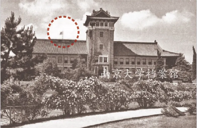 金陵大学北大楼侧后方、鼓楼百步坡上的日本领事馆上空的日本旗帜