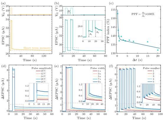 图2:短时可塑性的实验模拟。(a)莫尔突触晶体管对短时记忆行为的模拟。(b-c)莫尔突触晶体管对双脉冲异化行为的模拟及双脉冲异化指数随施加脉冲间隔的变化关系。(d-f)在不同强度的外部刺激下(改变施加脉冲的幅值、宽度、数目),莫尔突触晶体管的动态电流变化展现出可分辨的动力学行为。