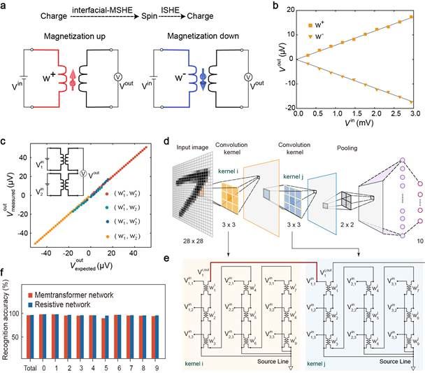 最后,研究团队利用界面磁自旋霍尔信号受磁矩调控且高度线性的特性,结合高效非局域自旋探测方案,提出了新型存内计算器件memtransformer。该器件具有非易失性,输入的电压信号经电荷-自旋-电荷转化过程最终以电压信号输出(图4a),且输入输出信号存在受磁矩调控的线性对应关系(图4b)。基于上述特性,memtransformer器件阵列可用作存内计算并且具有可级联性,有望解决电流-电压信号转化中的功耗问题。作为概念验证演示,研究团队基于两个互联的memtransformer器件,展示了向量相乘运算(图4c)。进一步,研究团队提出了基于memtransformer器件阵列的双值卷积神经网络(图4d-e)。该网络卷积层间连接无需激活函数,其对MNIST手写数字识别的准确率与基于阻变器件网络的识别准确率相当(图4f)。该工作为探索实现新的自旋-电荷转化机制以及扩展相应材料平台提供了范例,同时也为低功耗自旋存内计算提供了新的思路。