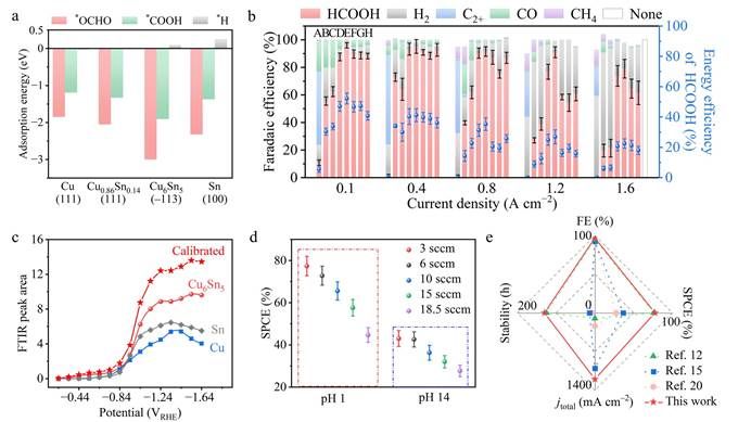 在强酸电解液条件(pH 1)下,不同比例的Cu?Sn样品进行了电化学性能测试,确定Cu6Sn5具有最优的甲酸选择性和能量效率。使用DFT理论计算和ATR-FTIR表征相结合的手段对中间体覆盖度进行了研究,DFT计算结果表明Cu6Sn5 (?113)晶面对甲酸中间体*OCHO具有强吸附能,且弱*H吸附能,促进CO2R反应,抑制HER,证实了*OCHO覆盖度明显增强是Cu6Sn5催化剂实现酸性CO2电解高活性、高选择性的主要原因之一。Cu6Sn5在pH 1电解液中的单次碳转化效率(SPCE)最高可以达到77.4%,为当前研究的最高值之一。