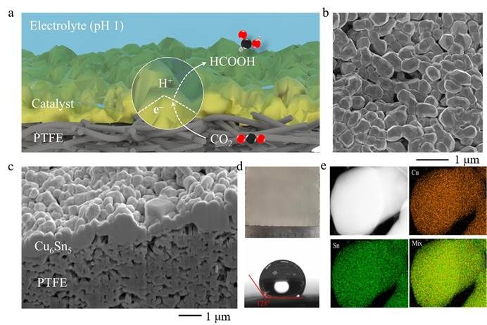 如图1中的SEM所示,300–600 nm Cu6Sn5导电晶粒密集堆积在气体扩散电极PTFE表面,Cu6Sn5催化剂表面水接触角为128°,表现出良好疏水性,保证气液固三相界面进行反应。XRD和STEM-EDX确定了Cu6Sn5晶体颗粒以及Cu和Sn元素在Cu6Sn5中的均匀分布。