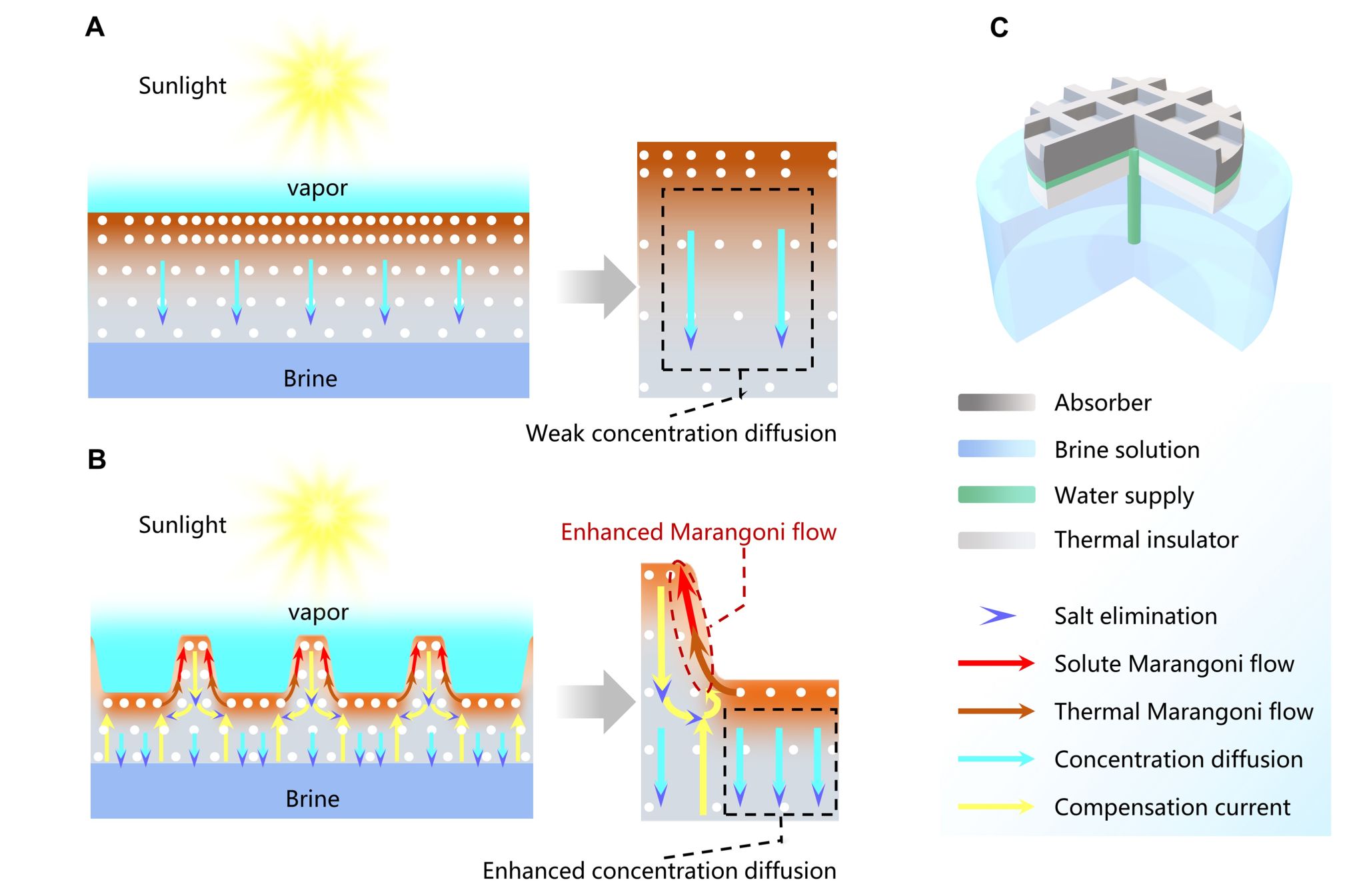 为克服结盐问题,学者们发展了多种技术,包括基于马兰戈尼效应来驱动对流以抵抗结盐。尽管取得了很多进展,但仍存在一些挑战。首先,马兰戈尼效应依赖于表面张力梯度,因此它与液气界面的面积有关。如果液体的暴露表面面积小,则马兰戈尼流亦较弱。其次,浓度差和温度差诱导的马兰戈尼流的作用力方向,有时候不一致,影响了抵抗结盐效果。