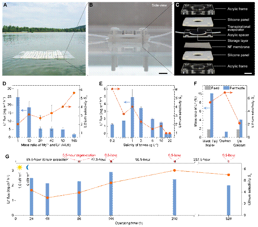 此外,界面光热盐湖提锂装置还具有良好的兼容性和可扩展性。通过优化离子分离层,单级装置的锂选择性提升了6倍;通过多级提锂工艺,锂选择性可提升近40倍。模块化设计赋予该系统良好的扩展能力,锂产量随模块数量线性增长,充分展示了其在大规模应用中的潜力。