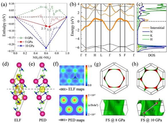 图1 (a)钾铵化合物的包络线;(b)R-3m相的能带投影以及(c)态密度投影;(d)电子局域化函数和(e)价电子的实空间分布,以及(f)它们的实空间切面;(g)和(h) R-3m相分别在8 GPa和10 GPa的费米面形状及鞍点位置。