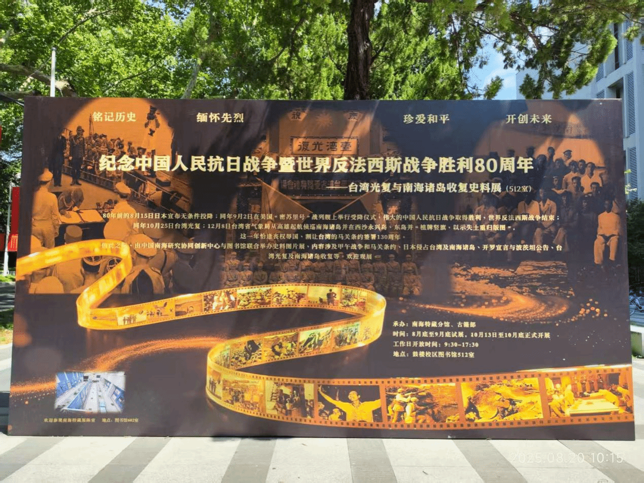“纪念中国人民抗日战争暨世界反法西斯战争胜利80周年——台湾光复与南海诸岛收复史料展”在凯发k8官网鼓楼校区图书馆预展