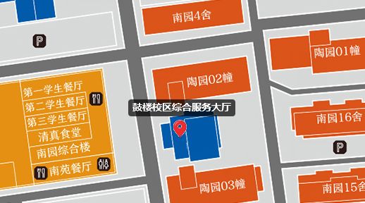 鼓楼校区原大学生活动中心,学生食堂对面。(见下图)